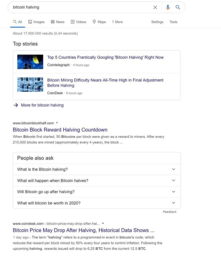 At present there is an all-time high (ATH) interest for the search term – “Bitcoin Halving” – which is likely to be one key influence (of many) on these recent price surges. The increase in searches may be down to beginners trying to understand what the halving might mean for Bitcoin – with this creating a natural price increase as a result of the basic supply and demand concept.